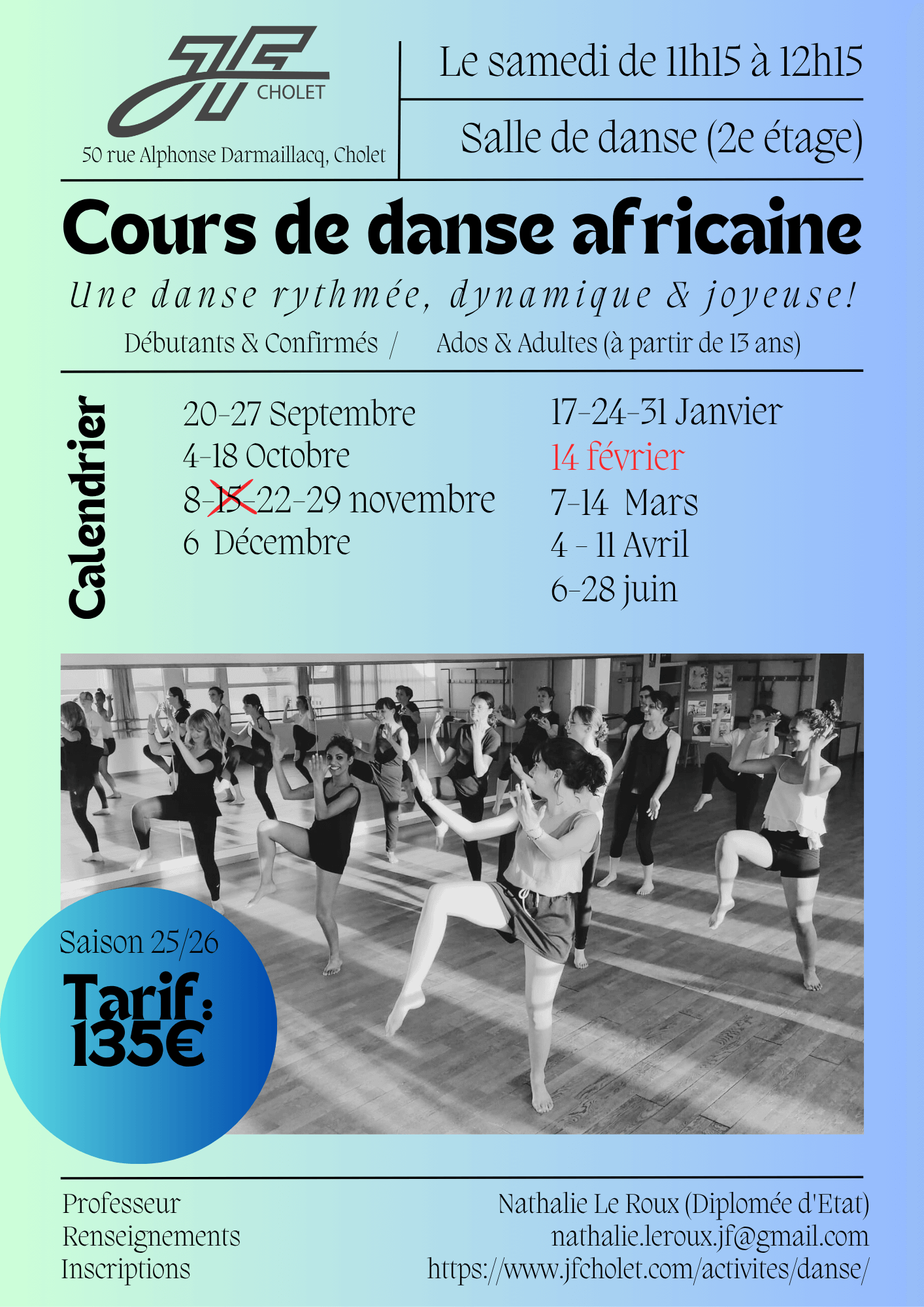 - Danse Africaine (18 séances/saison) : Planning Danse Africaine