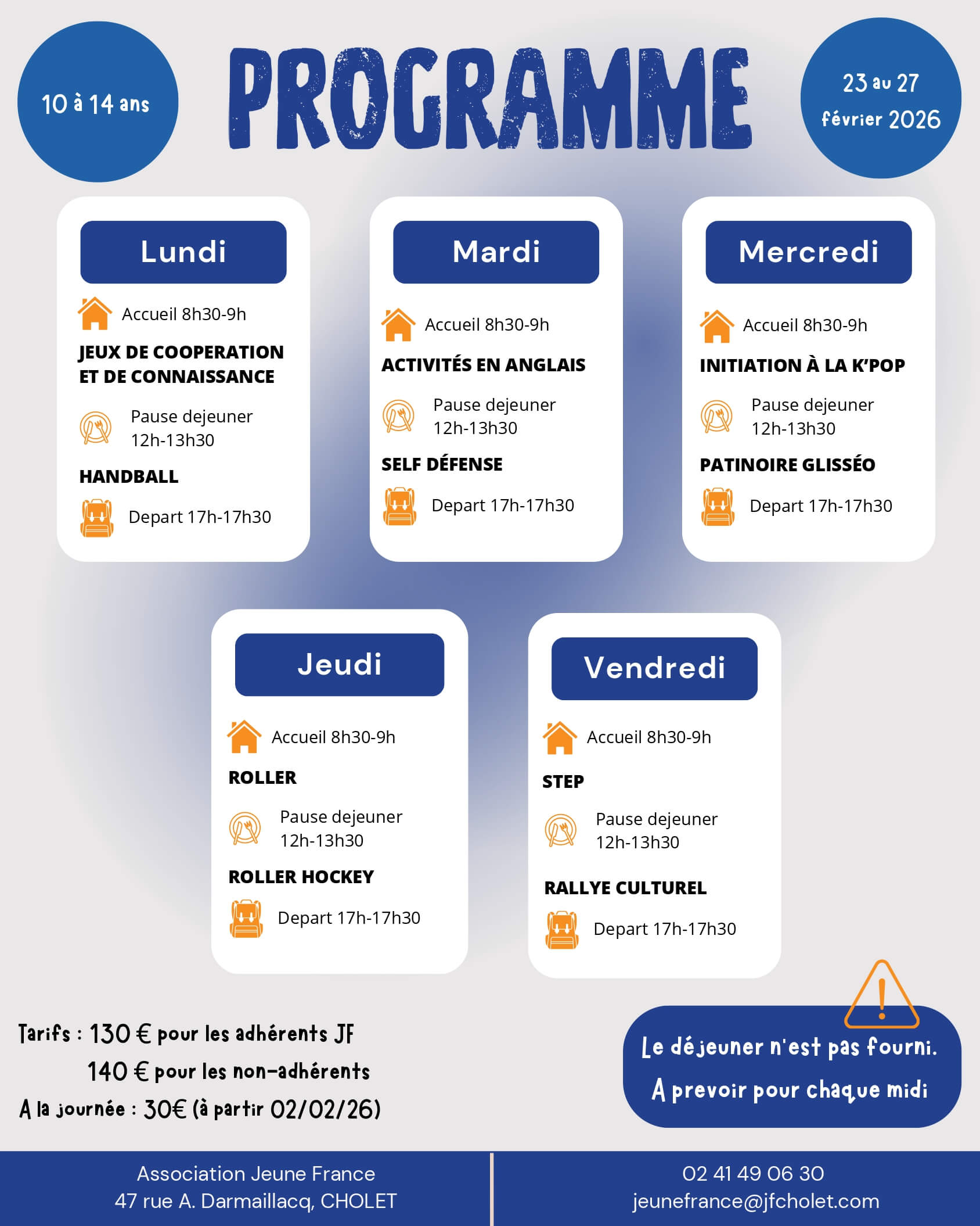 - Tarifs - Inscription à la semaine : Adhérents JF 130€, 140€ non adhérents JF - Inscription à la journée 30€ (dans la limite des places disponibles)